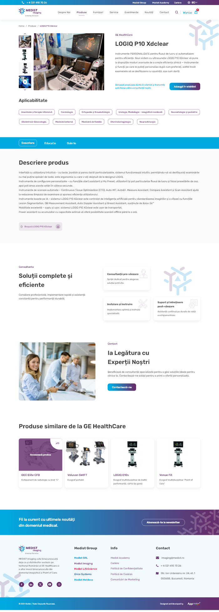 - Sisteme si produse – o arhitectura clara de categorii (radiologie, mamografie digitala, solutii chirurgicale, ambulante, medicina militara etc.), cu pagini de detaliu pentru fiecare produs, incluzand descrieri, imagini, avantaje, video si brosuri descarcabile.